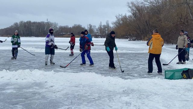 В Днепре на косе жилого массива Победа горожане вышли на замерзший водоем, чтобы сыграть в хоккей под открытым небом.
