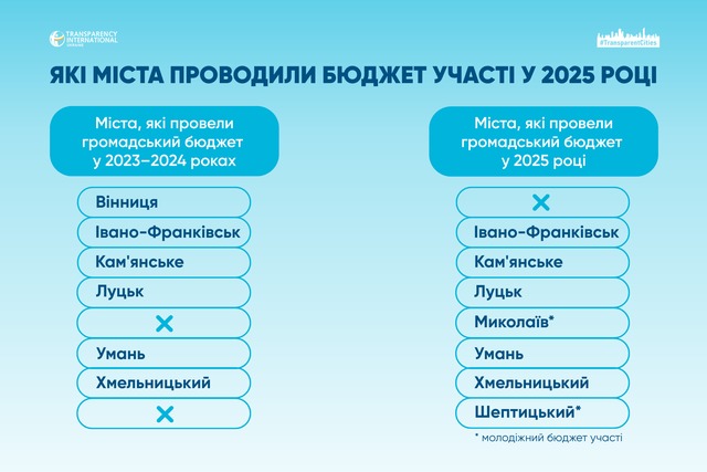 Программа «Прозрачные города» снова проверила, как в городах работает общественный бюджет во время военного положения. В 2025 году из 50 крупнейших городов конкурс провели всего семь.