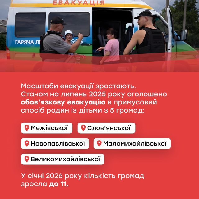Від липня 2025 року було оголошено обов’язкову евакуацію у примусовий спосіб дітей із батьками чи іншими законними представниками з п’яти громад Синельниківського району. За пів року масштаби евакуації зросли більш ніж удвічі – з п’яти до одинадцяти громад.