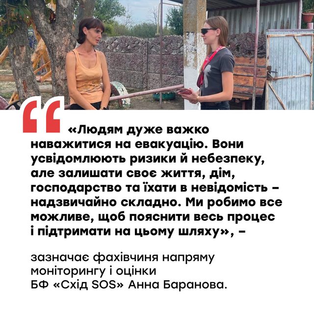 БФ «Схід SOS» безоплатно евакуює адресно. Ми опікуємося представниками маломобільних груп, зокрема й сім’ями з дітьми, людьми з інвалідністю та старшого віку, власниками домашніх улюбленців. Команда супроводжує постраждалих під час пошуку тимчасового місця проживання, розміщує до осель стаціонарного догляду з постійним наглядом або допомагає дістатися близьких.