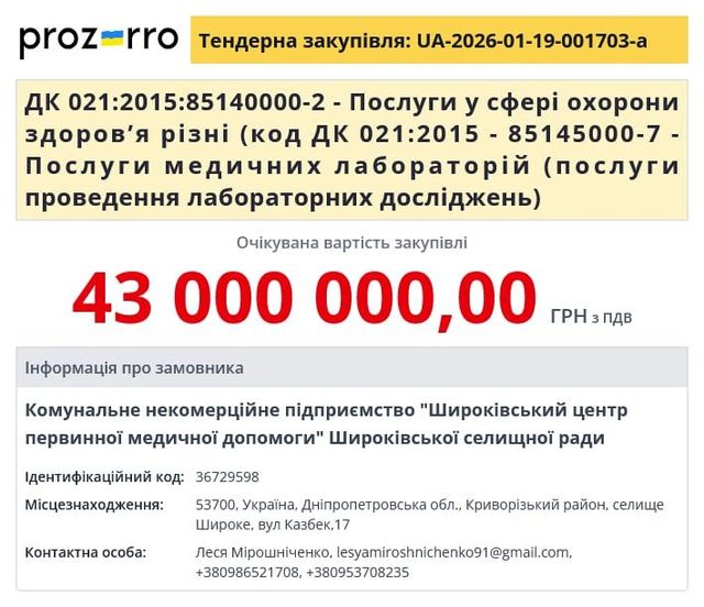 За 43 миллиона гривен победитель тендера должен предоставить в течение 2026 года 163 услуги лабораторных исследований.