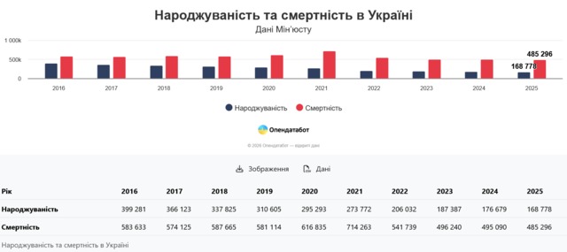 168 778 новорожденных зафиксировано в Украине в прошлом году. После кризисного 2022, когда рождаемость сократилась на 25%, снижение постепенно замедляется: в 2024 году оно составляло 6%, в 2025-м — 4,5%. Заметим, что к началу полномасштабного вторжения год к году рождаемость сокращалась, в среднем, на 8%. Впрочем, если сравнивать с 2021 годом, разница остается ощутимой – детей рождается в 1,6 раза меньше.
