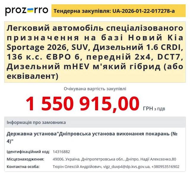 Это учреждение выступает заказчиком тендера «Легковий автомобіль спеціалізованого призначення на базі Новий Kia Sportage 2026, SUV, Дизельний 1.6 CRDI, 136 к.с. ЄВРО 6, передній 2x4, DCT7, Дизельний mHEV м'який гібрид (або еквівалент)», который объявлен в системе Прозорро.