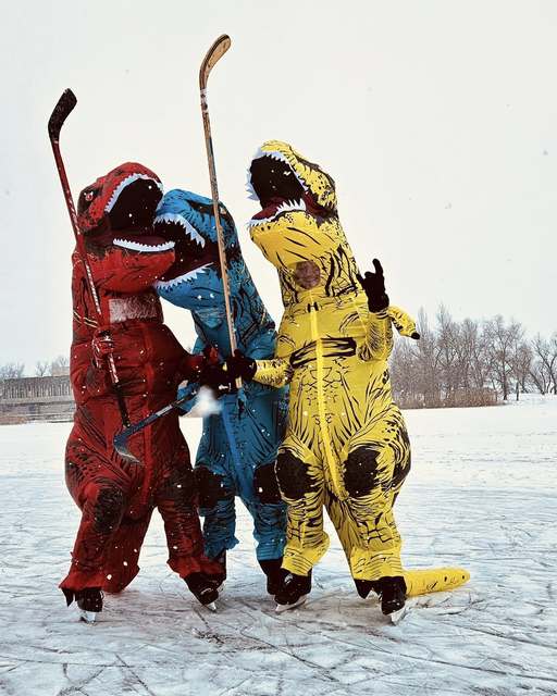 А теперь они провели необычный хоккейный матч в образе динозавров. Такие костюмы у этого клуба есть уже несколько лет.