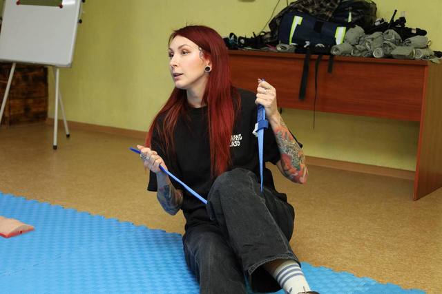 Заняття провела Маргарита — інструкторка з домедичної допомоги, парамедикиня та учасниця бойових дій. Вона має реальний досвід служби на Запорізькому та Бахмутському напрямках, тож тренінг був максимально практичним і зрозумілим 💡