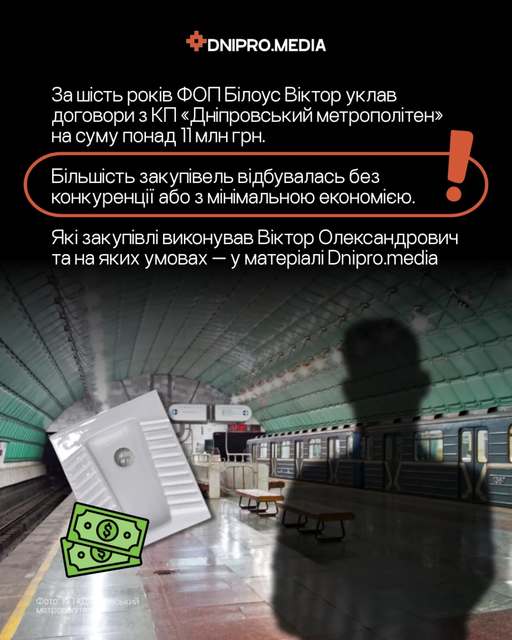 «ФОП Білоус Віктор Олександрович за 6 років отримав понад 11 млн грн від КП «Дніпровський метрополітен». Більшість закупівель відбувалась без конкуренції або з мінімальною економією. Які закупівлі виконував Віктор Олександрович та на яких умовах — читайте в матеріалі Dnipro.media.