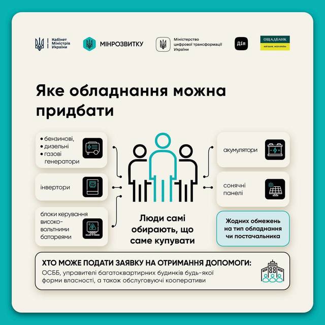 Правительство приняло решение о предоставлении государственной помощи от 100 до 300 тысяч грн для ОCББ, жилых и обслуживающих кооперативов, управляющих многоквартирных домов любой формы собственности на закупку генераторов, аккумуляторов, инверторов и другого энергооборудования. Подать заявку могут объединения совладельцев и управляющие домов онлайн через Дию.