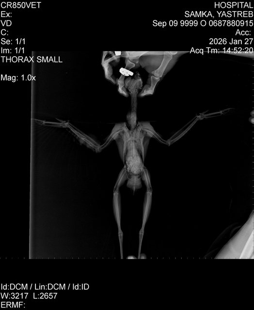 Самка яструба малого, Мадам, приїхала через Olesya Kulyk та за допомогою Марина Фесенко з Запоріжжя. Там вона потрапила на подвір'я до людей після прильоту. Багатоуламковий перелам правої локтьової кістки. Вважаючи на форму, кількість і диспозицію уламків, а також беручи до уваги, що Яструби малі - то "кришталеві пташки", та погано переносять наркоз, було прийняте рішення пробувати зрощувати на наружній фіксації, без операції».
