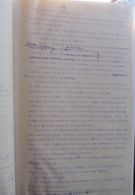 «…за півгодини мертвої тиші по проспекті проїхало кроком двоє вершників із наганами в руках. Скоро з’явився невеликий загін кавалерії. Потім двоє вершників повернулися і тоді почали йти з боку вокзалу перші загони червоної армії.