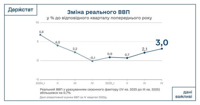 Госстат зафиксировал рост реального ВВП Украины в IV квартале 2025 года на 3,0% по сравнению с аналогичным периодом 2024 года. По сравнению с предыдущим кварталом ВВП увеличился на 0,7%.