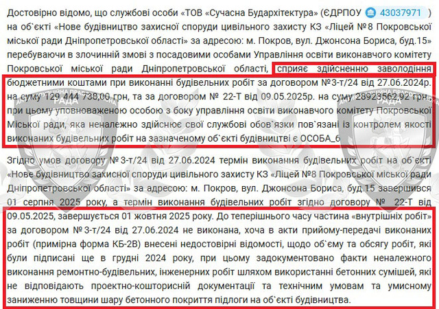 За версією слідства посадовці Управління освіти Покровської міської ради та службові особи ТОВ «Сучасна Будархітектура» діяли у змові під час реалізації наддорогих будівельних контрактів.