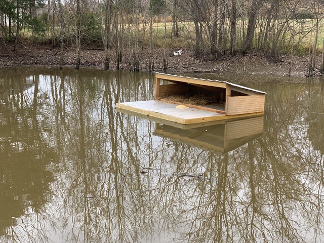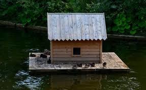 Больше вырисовывается вариант, на деревянных или металлических сваях. Пруд не глубокий, ориентировочно метр, метр двадцать. Практично и логично, вбить сваи, а к ним крепить плавающую конструкцию с укрытием. Потребуются сваи около 3 метров длинны, чтобы забить в дно, минимум нужно 2-4 сваи, а к ним уже крепить «островки безопасности». Так же можно брать за основу решение с «якорем», грузом на тросе (цепь, канат и др). А к нему уже крепить наш остров или пару островов.