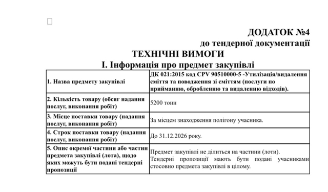 Згідно з проєктом договору, після вивантаження на полігон право власності на них переходить до виконавця. Також, щомісяця сторони звіряють обсяги прийнятих відходів».