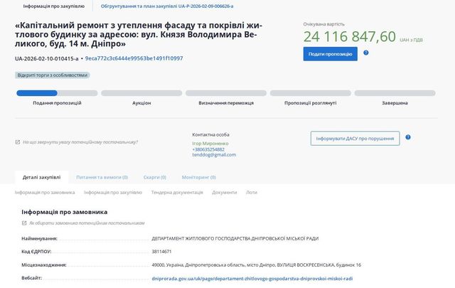 У Дніпро оголосили тендер на утеплення житлового будинку на вулиці Князя Володимира Великого, 14. Вартість проєкту перевищує 24 мільйони гривень, а завершити всі роботи планують до кінця 2026 року.