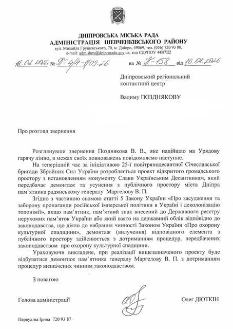 У Шевченківському районі міста Дніпро планують демонтувати пам’ятник радянському військовому діячеві Василю Маргелову.