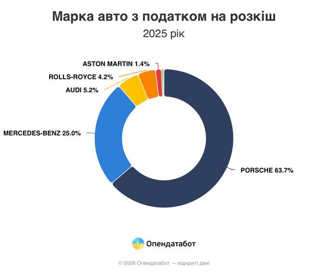 «504 автомобілі, що підпадають під податок на розкіш, імпортували у 2025 році в Україну. Це у 3,2 раза менше, ніж торік, і найнижчий показник за останні п’ять років.