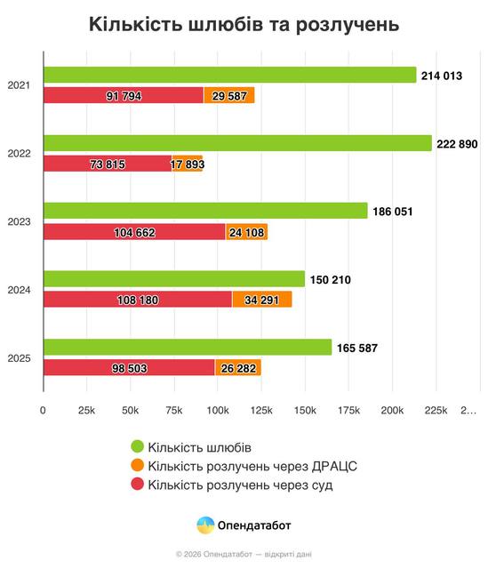 «165 587 шлюбів зареєстрували торік в Україні. Це на 10% більше, ніж у 2024. Водночас кількість розлучень скоротилась на 12% — до 124 785 випадків.