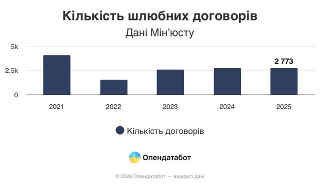 Водночас 2 773 шлюбні договори уклали торік. Це майже стільки ж, як і у 2024 році.