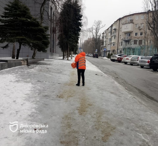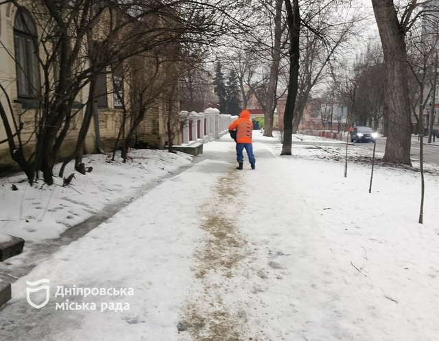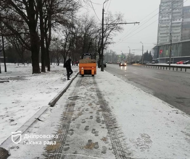 В Днепре ночью коммунальные службы очищают дороги и тротуары и обрабатывают покрытие противогололедными материалами.