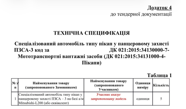 Йдеться про броньовані автомобілі типу пікап класу захисту ПЗСА-3. За основу беруть Mitsubishi L200 або іншу рівноцінну модель. Машини мають бути новими — не раніше 2025 року випуску.