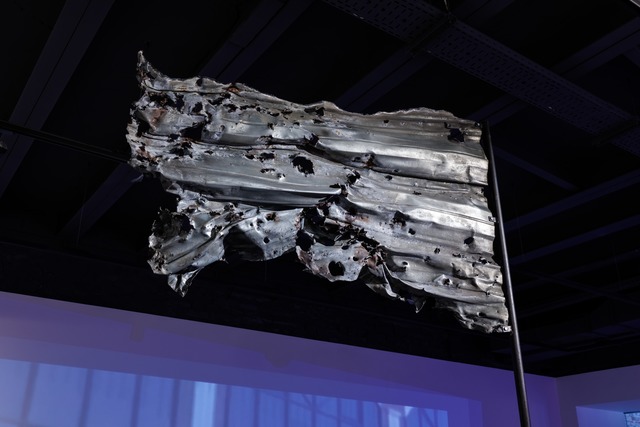 Метал, з якого виготовлено прапор, було привезено з теплоелектроцентралі (ТЕЦ) у Кривому Розі. Граніт, використаний для постаменту представленого на виставці прапора, походить із Коростишева — міста в Житомирській області, яке в травні зазнало масованої російської повітряної атаки, спрямованої проти цивільного населення. Коростишів відомий своїми гранітними кар’єрами й каменеобробними підприємствами, які, зокрема, виготовляють надгробки.