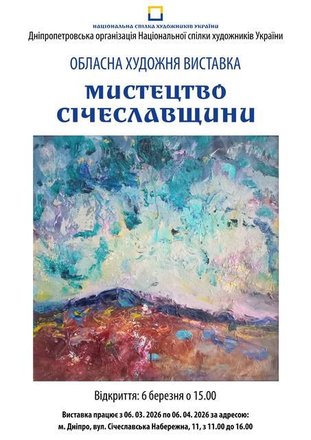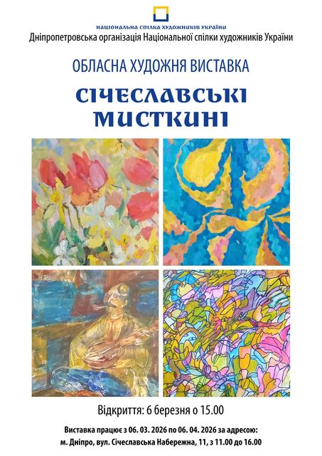 6 березня о 15.00 запрошуємо вас у виставкову залу ДОНСХУ на відкриття двох обласних виставок: "Мистецтво Січеславщини" і "Січеславські мисткині".