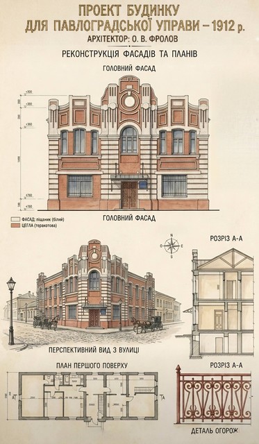 На «Перспективному виді з вулиці» ми бачимо ідилічну картину: бруківка, ліхтарі, коні з екіпажами. Саме таким був Павлоград напередодні Першої світової війни — місто, що мріяло про європейське майбутнє. Після 1917 року доля будівлі круто змінилася. Міська управа припинила існування. В радянський період будівлю пристосували під державні потреби. Міцні стіни Фролова витримали Другу світову війну, хоча місто сильно постраждало від руйнувань. Будівля вціліла, зберігши свій унікальний декор, хоча деякі елементи (наприклад, ковані огорожі, деталі яких ми бачимо на плані) були втрачені з часом.