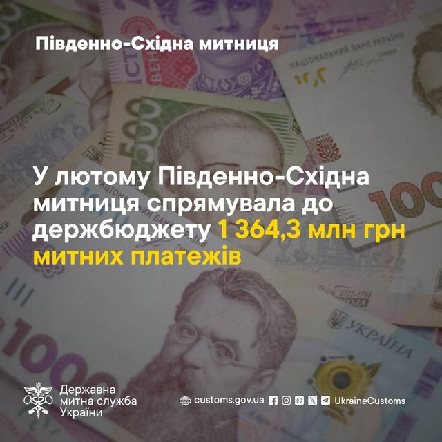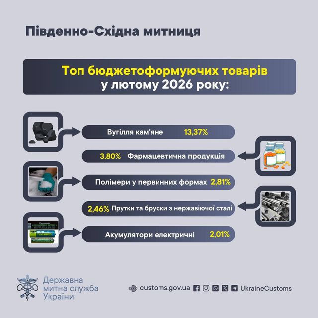 «За січень-лютий 2026 року Південно-Східна митниця перерахувала понад  2,6 мільярдів гривень до Державного бюджету України.