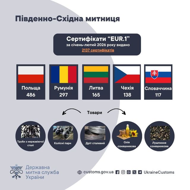 Водночас активно розвивається й експортний напрямок. Упродовж двох місяців митницею видано 2 137 сертифікатів з перевезення українських товарів форми EUR.1. Наявність такого сертифіката дозволяє вітчизняним товарам потрапляти на ринки ЄС без сплати ввізного мита — а отже, робить їх доступнішими та конкурентоспроможнішими.