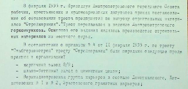 А судячи з документів, якраз у цей час, цегла з цим тавром випускалася на суміжних цегельних заводах №8 та №9. Так, саме так ці заводи і називалися з початку, а з 1935 року вони перебували у підпорядкуванні «Дніпропетровського міського комунального тресту підприємств будівельних матеріалів «Будкерамік». «Будкерамік» отримав у своє управління ці заводи та ще кілька суміжних підприємств відповідно до наказу №4 від 11 лютого 1935 року на тресті «Снабміськкомбуд», з метою збільшення виробництва будматеріалів.
