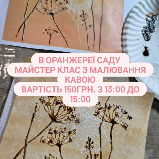 ОРАНЖЕРЕЯ: прогулянка, екскурсія, майстер клас з малювання кавою. Можна приєднуватися з 13.00 до 15.00. Попередній запис не потрібний. Вартість 150 грн.