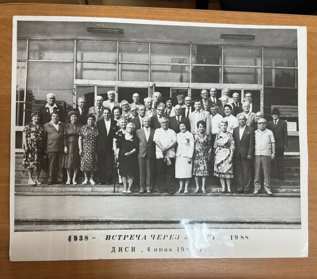 Окремої уваги заслуговує ще одна світлина, яку передав Віталій Олександрович — фото зустрічі випускників через 50 років після закінчення інституту. На ньому Ольга Акимівна знову разом зі своїм випуском — через пів століття. Це дуже теплий і символічний момент, що нагадує про цінність часу, дружби та пам’яті.