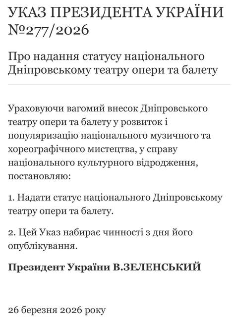 Днепровский академический театр оперы и балета получил статус национального. Такой указ подписал президент Владимир Зеленский.