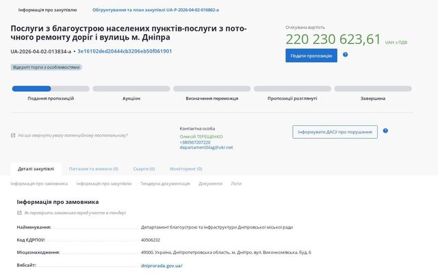 У Дніпрі планують витратити понад 220 млн грн на ремонт доріг. Департамент благоустрою та інфраструктури Дніпровської міськради оголосив тендер на поточний ремонт вулиць та транспортних розв’язок. Очікувана вартість робіт становить 220,23 млн грн.