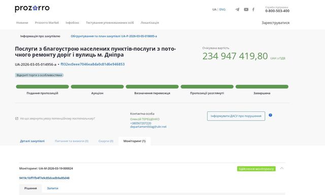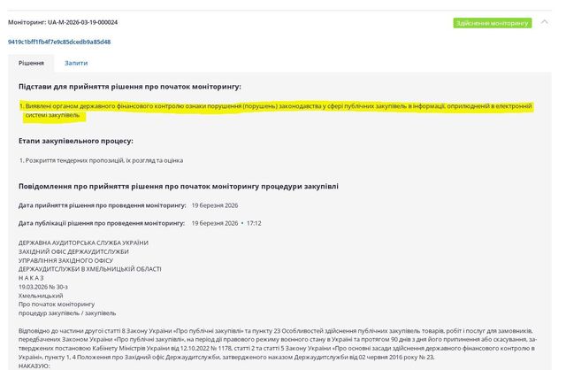 Згідно з даними на Prozorro, за цим тендером навіть підписали договір. Однак, є також інформація про те, що за цією закупівлею Державна аудиторна служба розпочала моніторинг щодо можливих порушень.
