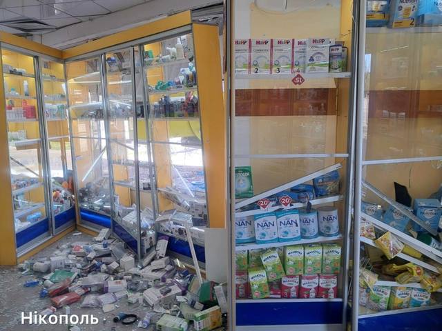 Повреждена аптека, многоэтажка и сгорела машина.