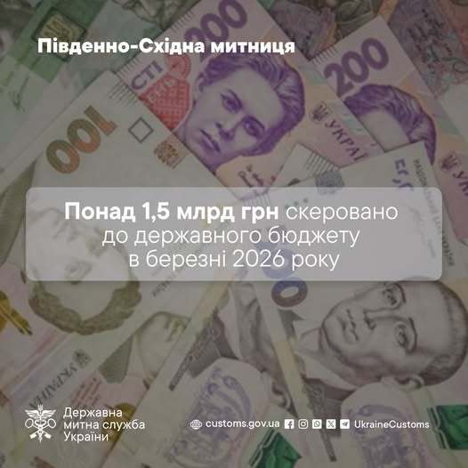 Благодаря этому за январь-март 2026 года Юго-Восточная таможня (Днепровская) перечислила в бюджет более 4,1 млрд грн таможенных платежей. По сравнению с аналогичным периодом прошлого года поступления увеличились на 2% (январь-март 2025 более 4 млрд грн).