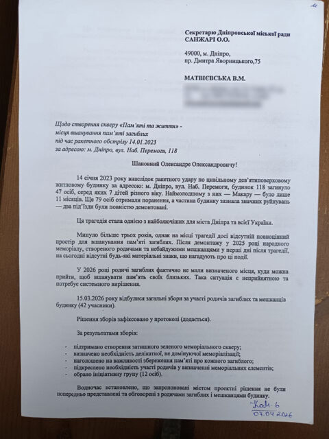 Мешканці будинку на Набережній Перемоги, 118 та родичі загиблих внаслідок російського ракетного удару, завданого 14 січня 2023 року, звернулися до Дніпровської міської ради з проханням про співпрацю у створенні меморіалу на честь жертв трагедії.