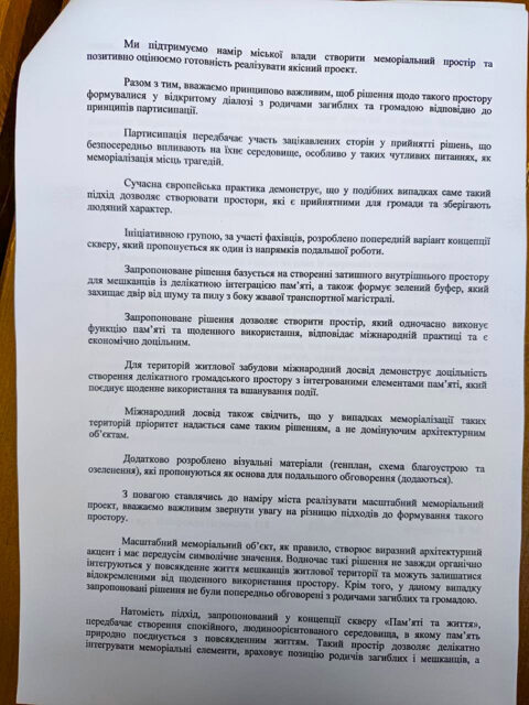«Масштабний меморіальний об’єкт, як правило, створює виразний архітектурний акцент і має передусім символічне значення. Водночас такі рішення не завжди органічно інтегруються у повсякденне життя мешканців житлової території та можуть залишатися відокремленими від щоденного використання простору. Крім того, у даному випадку запропоновані рішення не були попередньо обговорені з родичами загиблих та громадою. Натомість підхід, запропонований у концепції скверу «Пам’яті та життя», передбачає створення спокійного, людиноорієнтованого середовища, в якому пам’ять природно поєднується з повсякденним життям. Такий простір дозволяє делікатно інтегрувати меморіальні елементи, враховує позицію родичів загиблих і мешканців, а також відповідає принципам партисипації формування громадських просторів та сучасним європейським практикам», — йдеться у зверненні.