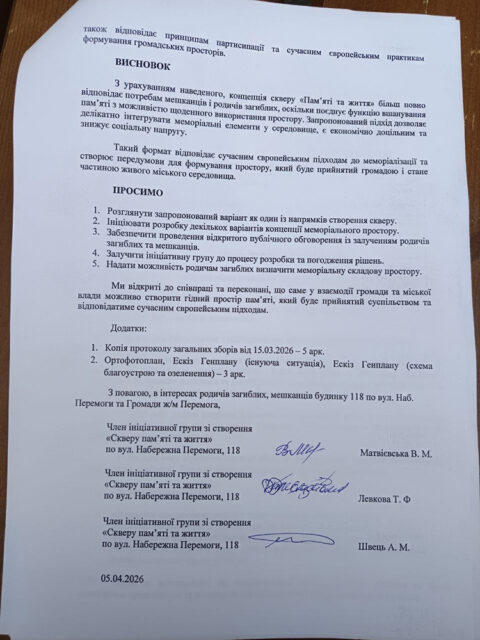 На громадських зборах, які відбулися 15 березня 2026 року, мешканці будинку на Набережній Перемоги, 118 вирішили, що найкращім вшануванням пам’яті 47 загиблих внаслідок російського ракетного удару буде облаштування «Скверу пам’яті та життя» з ненав’язливим меморіальним об’єктом.