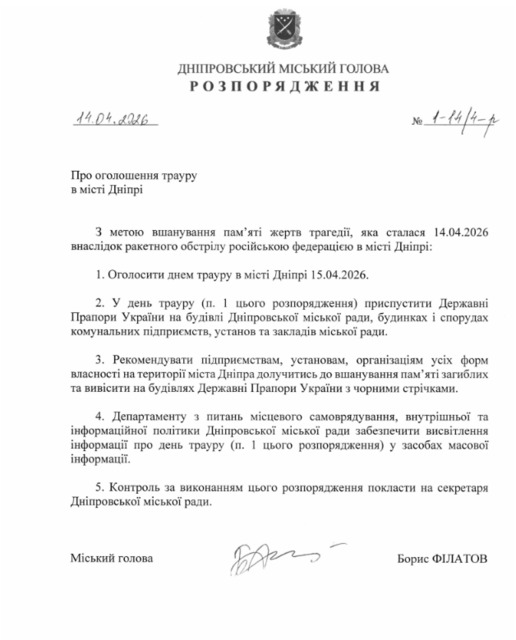 Завтра у Дніпрі оголошено день жалоби. Про це йдеться у розпорядженні мера Бориса Філатова.