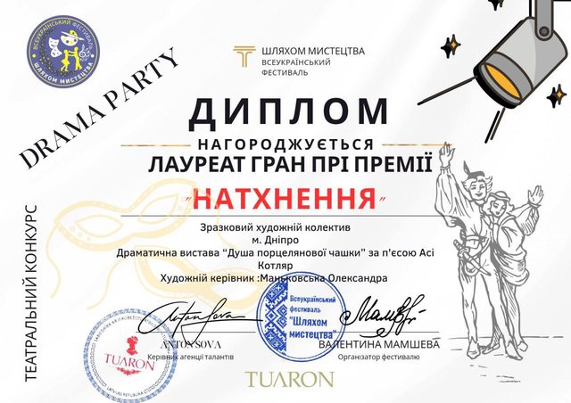 Найвищу нагороду — Гран-прі — колектив отримав за виставу «Душа порцелянової чашки», яка глибоко вразила журі та здобула найвищий бал у номінації «театральне мистецтво».