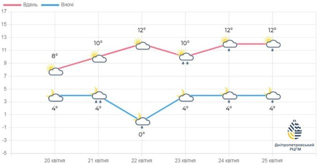 23-26 апреля под влиянием циклона с северо-востока ожидаются небольшие дожди и порывы ветра в дневные часы 15-20 м/с. Ночью 1..6°, днем ​​10..15°.
