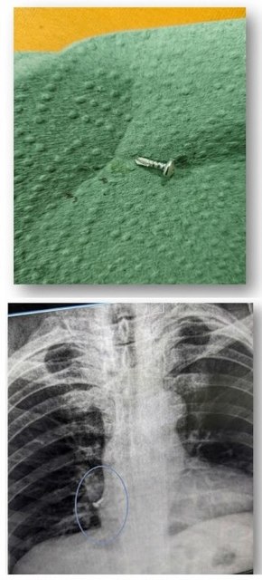 Саморіз на виробництві: Дорослий чоловік під час роботи випадково вдихнув металевий саморіз. Допомога була надана амбулаторно: наші фахівці швидко вилучили стороннє тіло з бронхів.