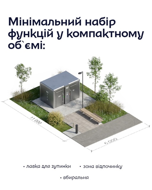 Новий модуль для відпочинку компактний розміром 11 на 6 метрів. Він включає сучасний туалет, світильник, лавочку, урну для сміття, міні-станцію для швидкого ремонту велосипеда і навіть невелику зелену зону з газоном.