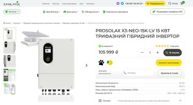 Наприклад, зараз гібридний інвертор Prosolax Х3-Neo-15K-LV на сайті Sanlarix пропонують за ціною 105.999 гривень.