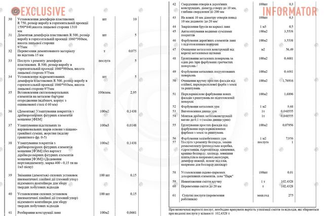 До переліку робіт входить також перевезення матеріалів, демонтаж конструкцій і вивезення сміття. Окремо закладені супутні послуги, зокрема перевезення працівників.