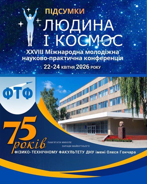 “На базі Національного центру аерокосмічної освіти молоді ім. О.М. Макарова завершила свою роботу XXVІІІ Міжнародна молодіжна науково-практична конференція «Людина і Космос». Конференція пройшла в очному форматі та режимі «on-line-конференції». Вона була присвячена 75-річчю від дня заснування фізико-технічного факультету Дніпровського національного університету імені Олеся Гоначара.