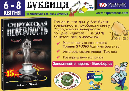 Трилев STUDIO пройдет «Диалог: Автор – Читатель». Со стороны Авторов традиционно примет участие Андрей Трилев, а также гости – главный редактор и арт-директор популярного всеукраинского журнала «Секс и город» Валерия Цеховская и Юлия Базарова. Со стороны же Читателей – все желающие.