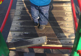 Доски еще лежат на месте, но крепления разрушены, поэтому в любой момент может образоваться дыра, куда способен провалиться ребенок.
